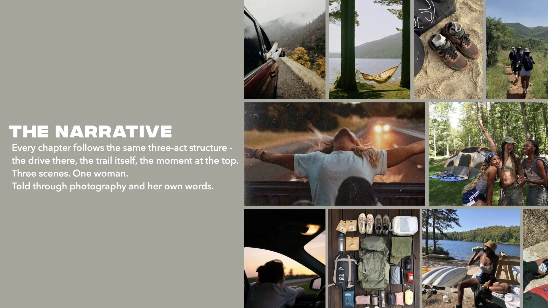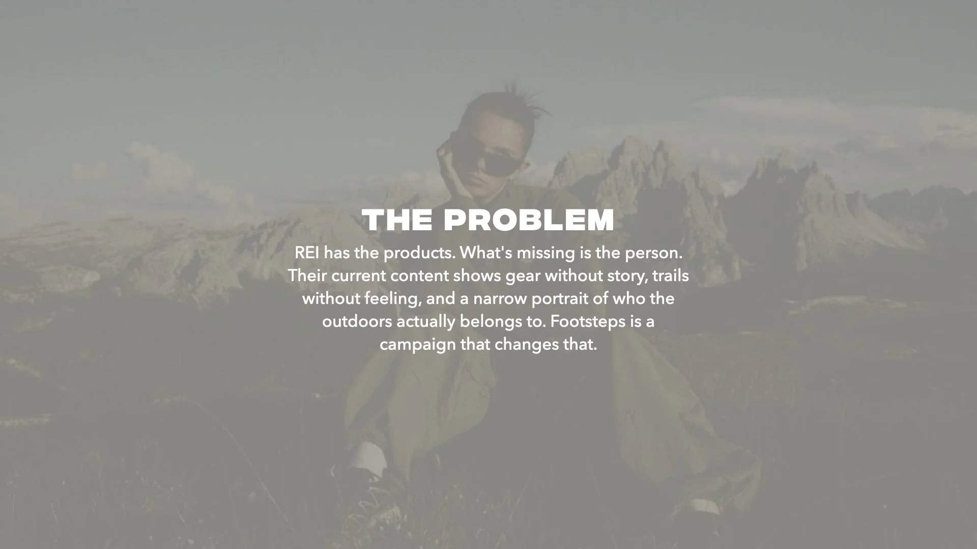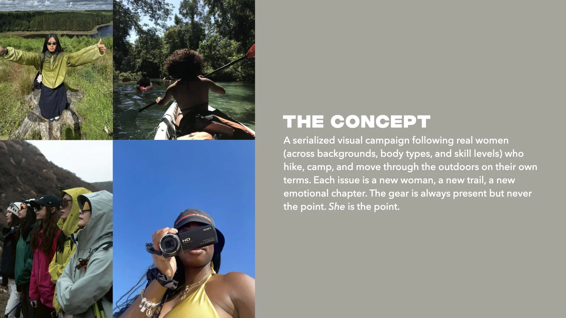 REI has strong products but weak storytelling. This campaign was built to close that gap with a visual campaign centered on real women across backgrounds, body types, and skill levels moving through the outdoors on their own terms. Each chapter follows a three-act structure. Yes, the gear is always present, but it's never the point.